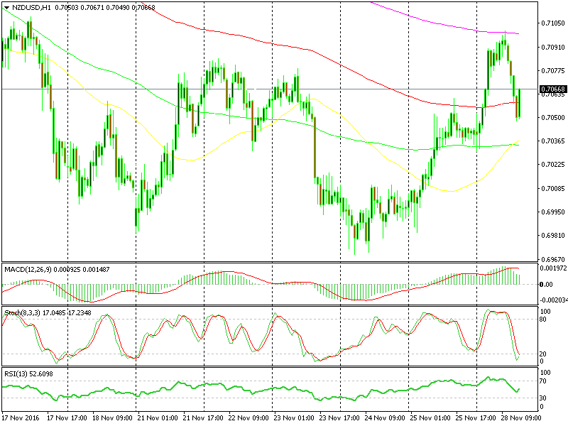We opened a sell NZD/USD signal up at the 200 smooth moving average (200 SMA) in pink this morning which hit take profit, but now the price has reached oversold levels. So, we considered this as a good opportunity to open another signal in this forex pair, but this time, a buy forex signal.