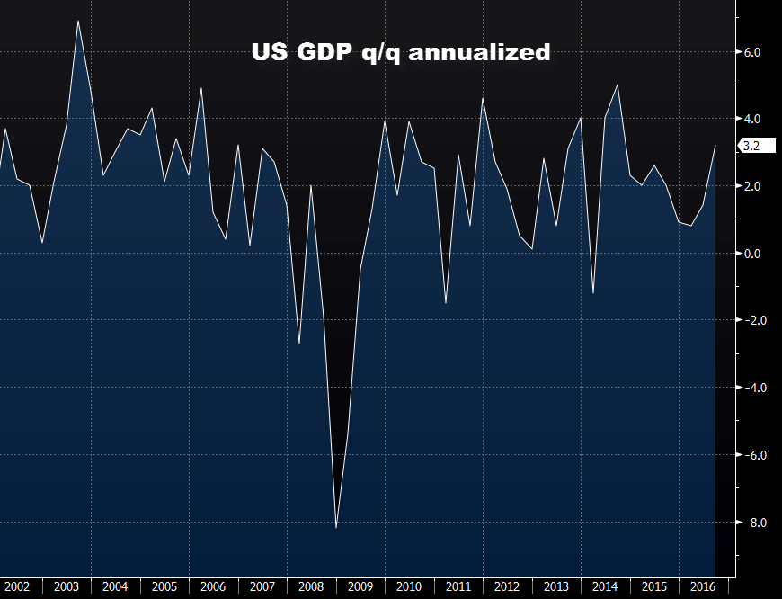 The second estimate for the US Q3 GDP was released a while ago and it looks pretty damn good. The annualized first reading put the yearly US GDP at 2.9% for 2016, but today´s numbers take it 3 points higher to 3.2%. You can´t argue with this number and it is the best quarter reading since the third quarter of 2014.