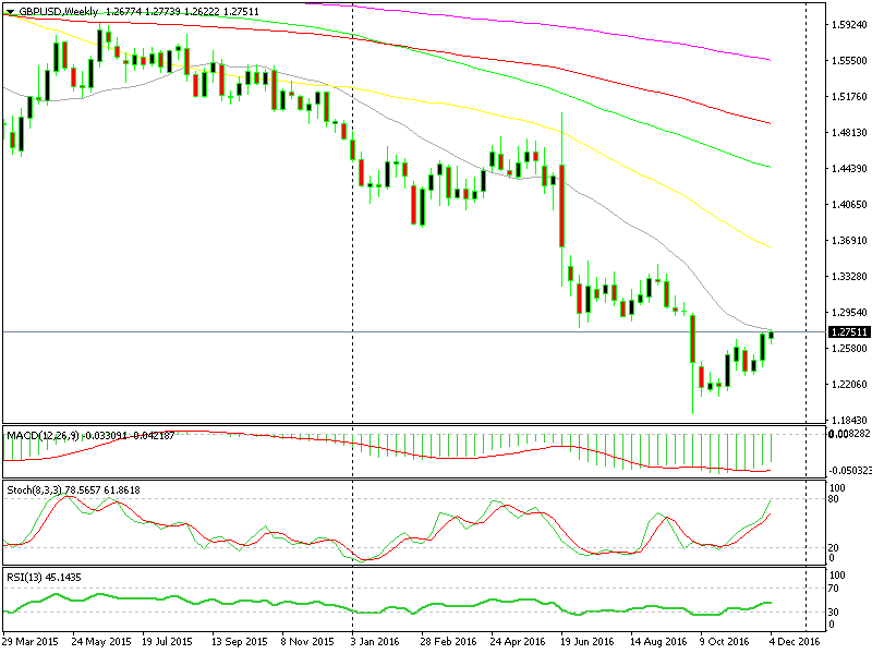 Looking at the weekly GBP/USD chart, we see that the price is sitting right below the 20 simple moving average (20 SMA) in grey. That hasn´t been a solid support/resistance level in the past, but if you look at the far left of the forex chart, you can see that it has provided support and resistance a couple of times last year.