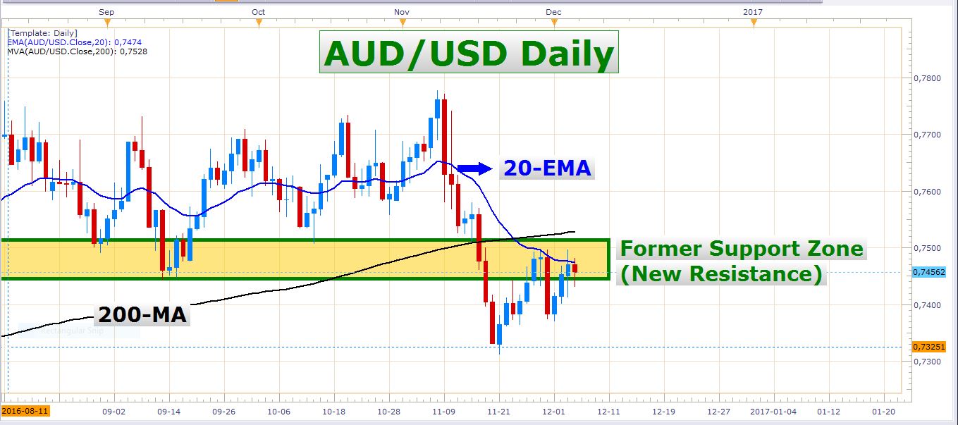 The AUD/USD has failed to overcome the 20-day exponential moving average for the second time in the last couple of trading days. Perhaps this dynamic resistance level will keep a lid on the exchange rate over the near-term. If this were the case, the Aussie could possibly revisit the November lows before the end of the year.