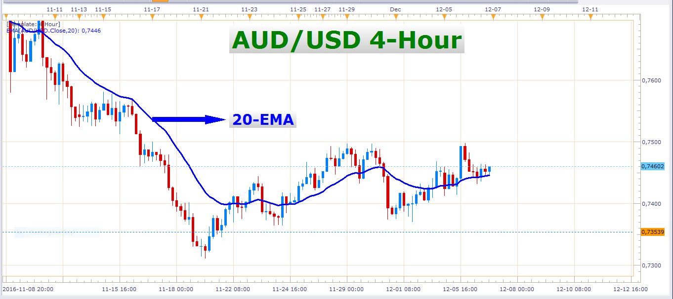 The technicals suggest a further decline in the AUD/USD exchange rate could be on the cards. Think about it this way, the pair is trading below its 200-day moving average, and its 20-day exponential moving average. This means the long-term trend and the short-term trend are both down. This means we only want to look for opportunities to sell this pair at the moment. Ideally, we want some kind of confirmation on the lower timeframes that the bears are taking a clean lead once again. The reason for this approach is because we’re currently in a price consolidation and the price is above the 20-EMA on the hourly and 4-hour charts. Look at this hourly chart: