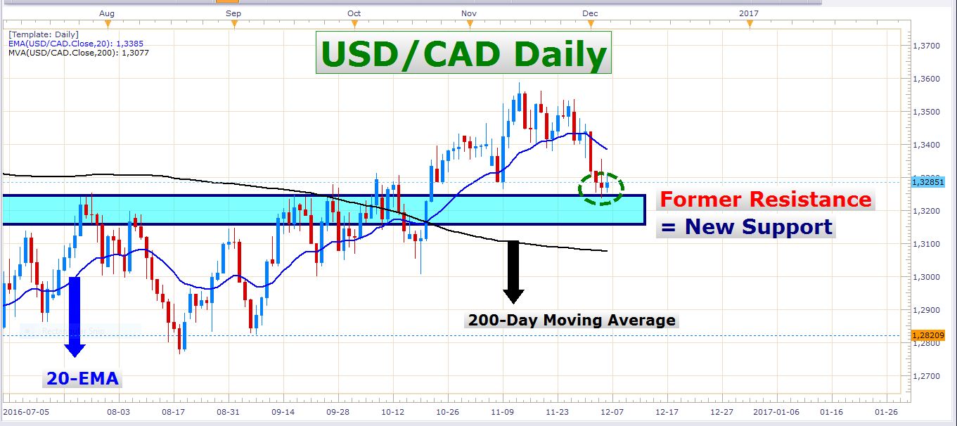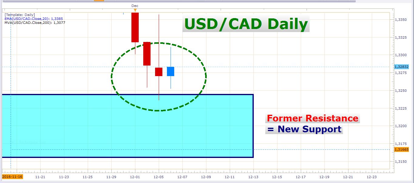 The USD/CAD has traded into a very important technical zone in the last few days. The previous resistance at this zone is what makes it so important. Many times an important resistance zone turns into an important support zone once it gets broken. This is often where buyers reload into some additional long exposure. Look at this daily chart of the USD/CAD:
