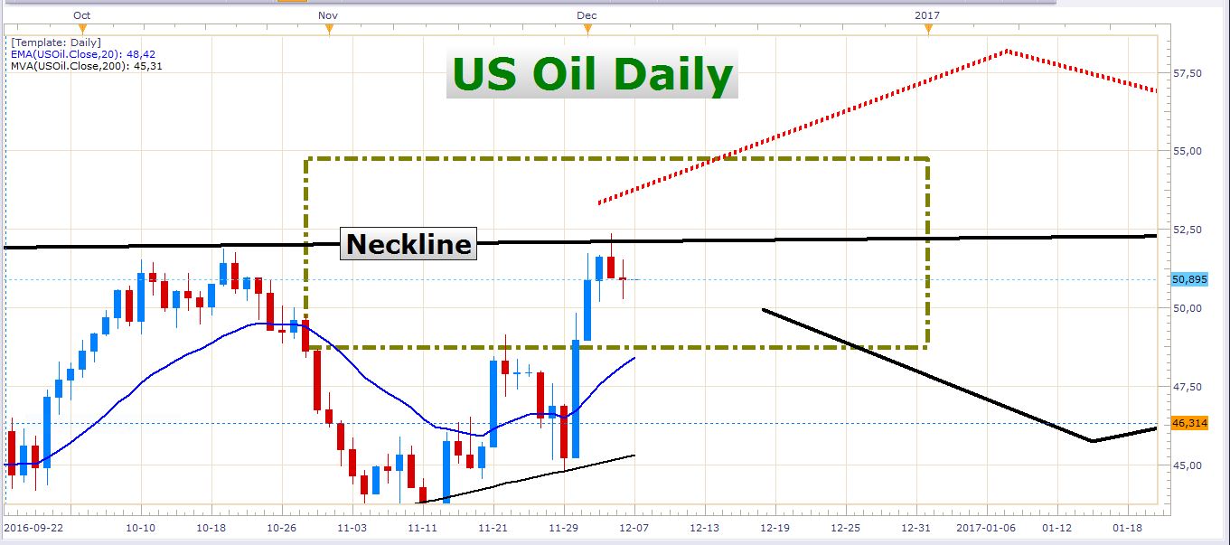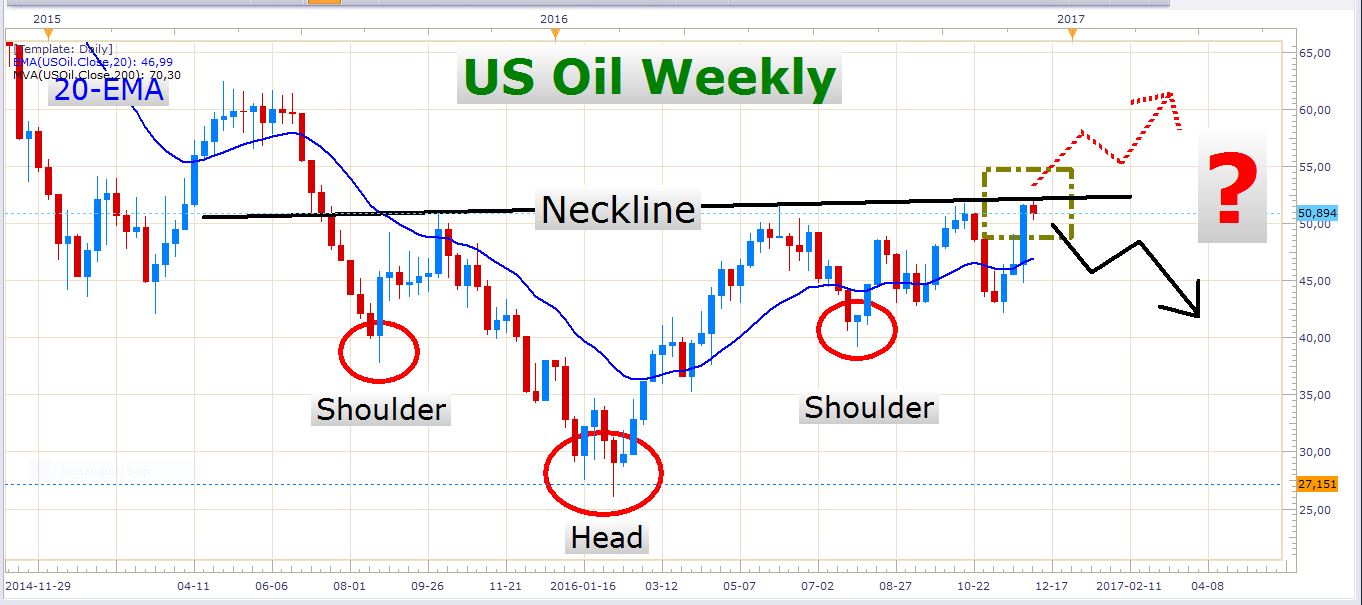 If we examine the price action of the largest commodity which drives the Canadian dollar, we see a large inverse head and shoulders pattern. At the moment, the oil price is trading at the neckline of this pattern, which makes this an important technical level.
