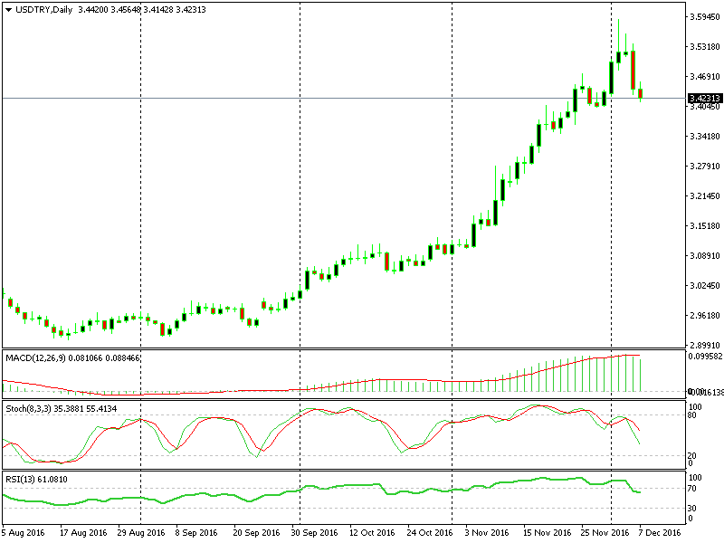 The first effects of the fabricated coup a few months ago are starting to show up. The Turkish Lira has been under pressure for a long time, but in the last month or so, USD/TRY has surged about 50 cents. I guess the investors are not feeling safe in Turkey anymore.