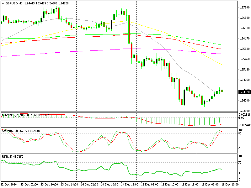 The 1.2440-50 level was the low yesterday, which makes it some sort of resistance level. However, the 20 moving average (20 SMA) is just below where the price is right now, which is holding it afloat and thus, going against our signal.