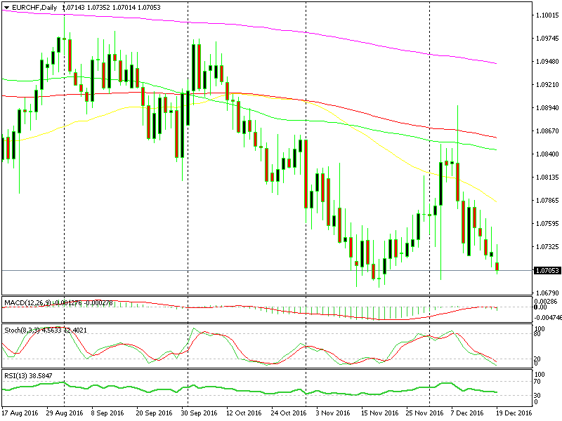 We have had a few short term forex signals a couple of weeks ago when the price was around these levels, as well as a long term signal, but as the price moved above 1.08 during the Euro reverse after the Italian referendum, trading opportunities became scarce. Now, the price is back down at the 1.07 level.