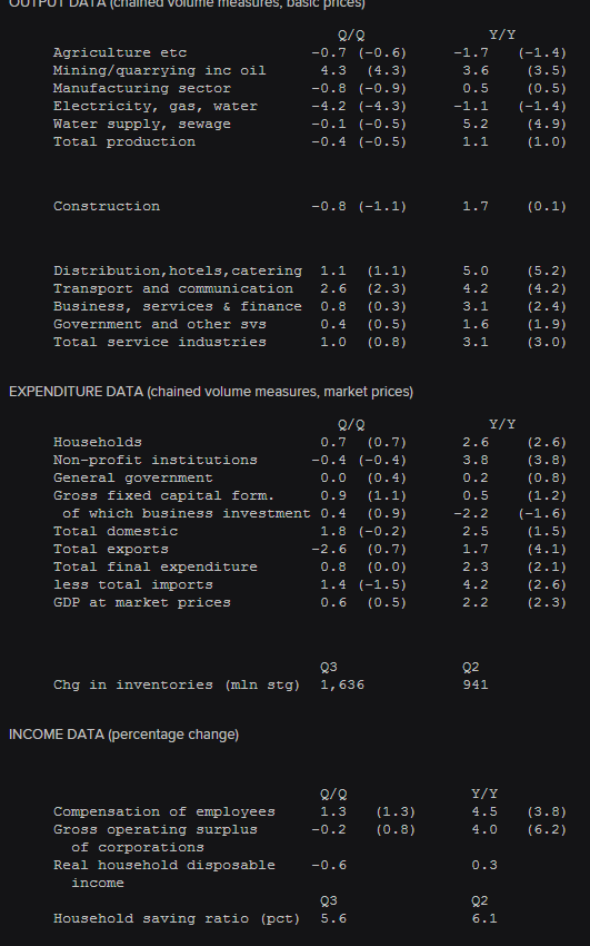 This looks all great, but if we dig deeper into the GDP report, then things are not all rosy. The previous two quarters were both revised down a point each, which means that even with the higher Q3 GDP, the overall UK economy is a point worse than previously thought. The yearly GDP number, which came at 2.2% against 2.3% expected, clearly shows that.