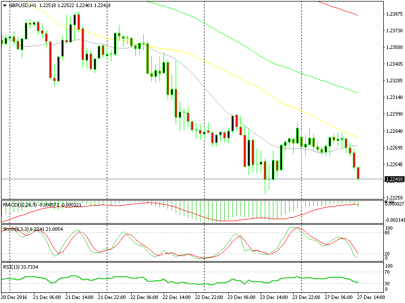 GBP/USD is the biggest mover today and looking at the hourly forex chart we can say that our trading opportunity looks pretty good. It didn´t look that good a few hours ago when the price was banging its head against the 50 simple moving average (50 SMA) around the 1.2285 level, but now this forex pair is more than 40 pips below there. All we need is another few pips for that forex signal to hit the take profit target.