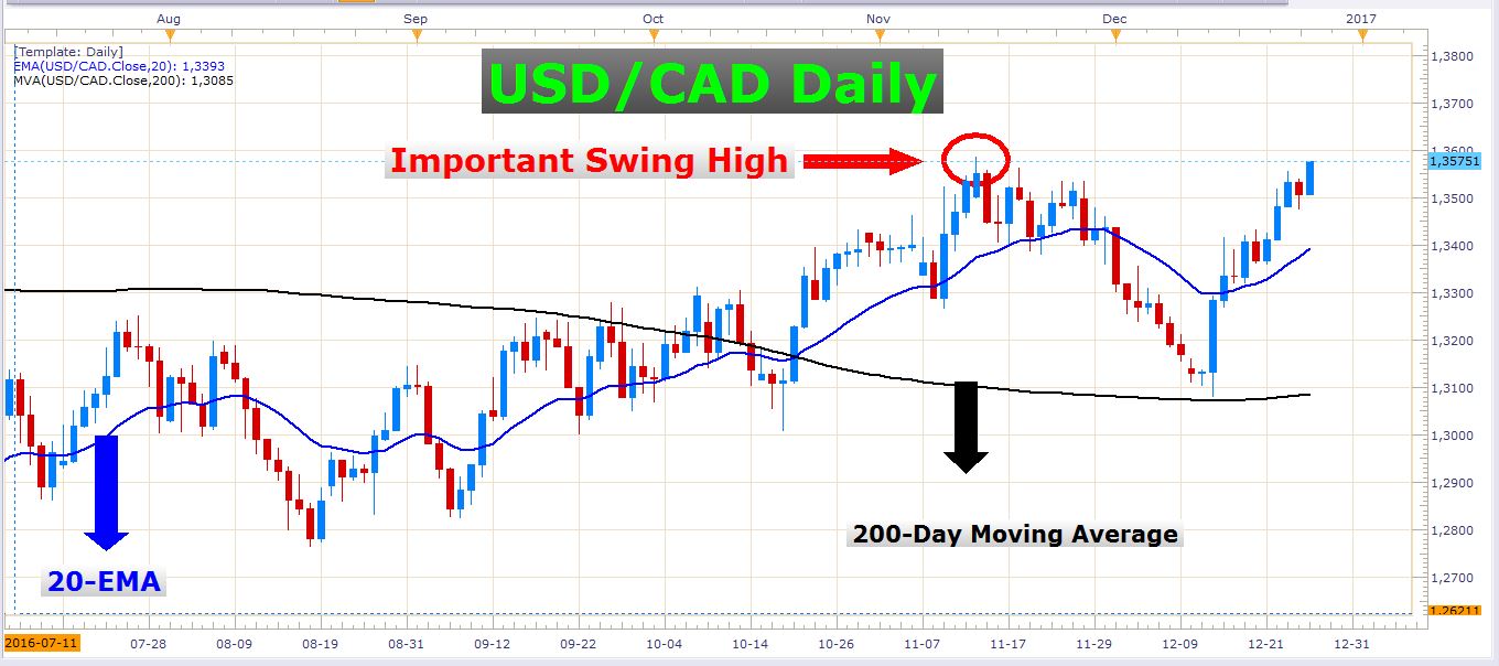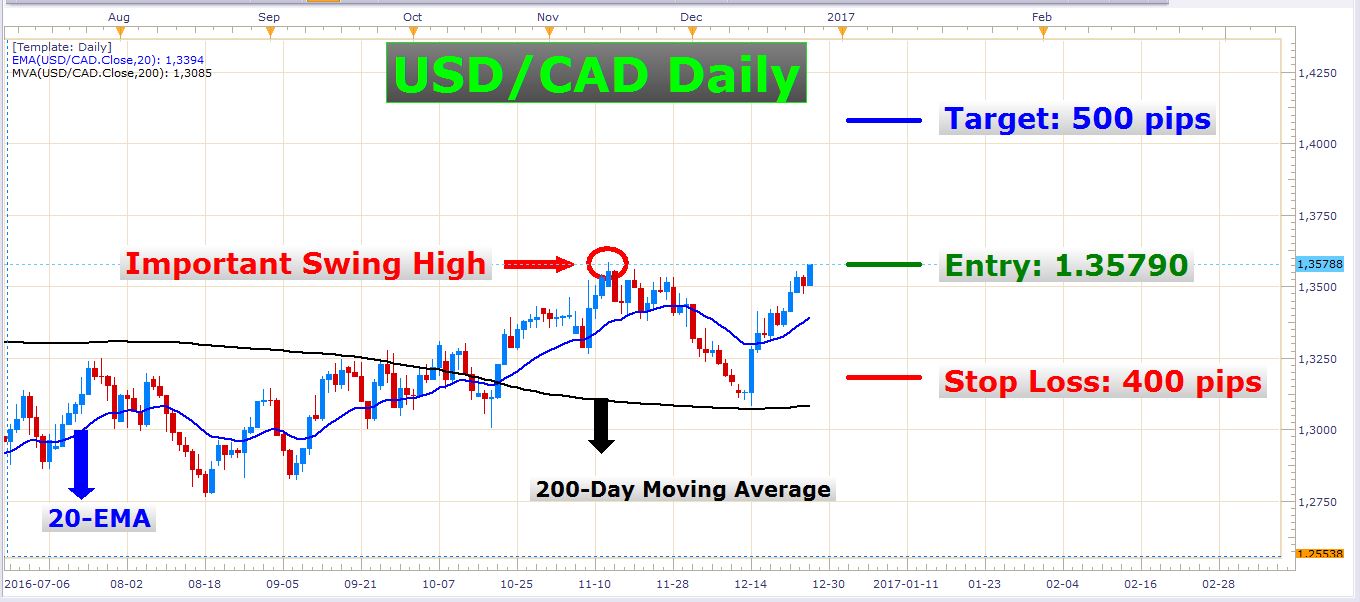 It is evident that the bullish market players are controlling the market. One of my teachers once taught me not to fight the institutional participants which are the ones who move and control the currency market. These are the guys throwing around millions and billions of dollars all over the scene as if it were small change. New traders often trade against major momentum which is something that drains their accounts quickly. Picking tops and bottoms in strong trends is very dangerous. Trading with the trend is where the big money lies, and that is exactly what I’m talking about in this instance. For many weeks the USD/CAD has been printing higher highs and higher lows – the vital characteristics of a healthy uptrend. At this very moment, the pair is about 12 pips away from breaching another important swing high on the weekly (and daily) chart. The chances of reaping some more upside from this pair are good, so let’s look at how we can play it…