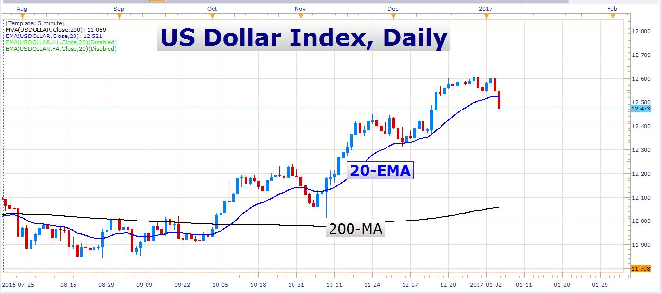 After a very extended winning streak, the US Dollar took a sizeable knock today. This decline is the largest daily decline since September last year. Look at this chart of the US Dollar index: