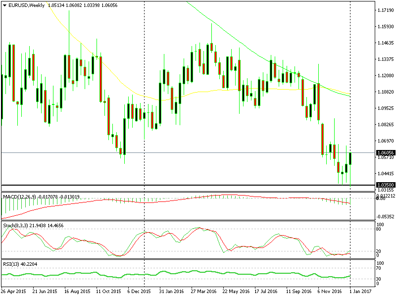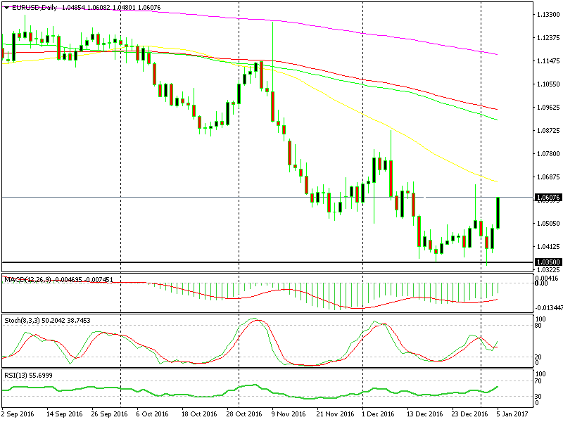 On Friday, we posted an update about a trade opportunity in EUR/USD. This forex pair surged from 1.0370 on Wednesday to 1.0660 on Friday morning which opened up a window for a long term sell forex signal. We didn´t take that trade because the surge higher happened very quickly and the reverse was just as quick, which didn´t give us a chance to pull the trigger.