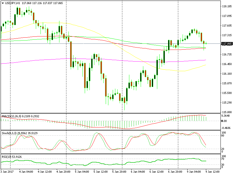 As you can see from the USD/JPY chart below, this forex pair has extended its upward move it started on Friday after the US average hourly earnings (wages/salaries) rose more than expected. It reached as far up as 117.53, but it has been making a retrace in the last several hours to 117.