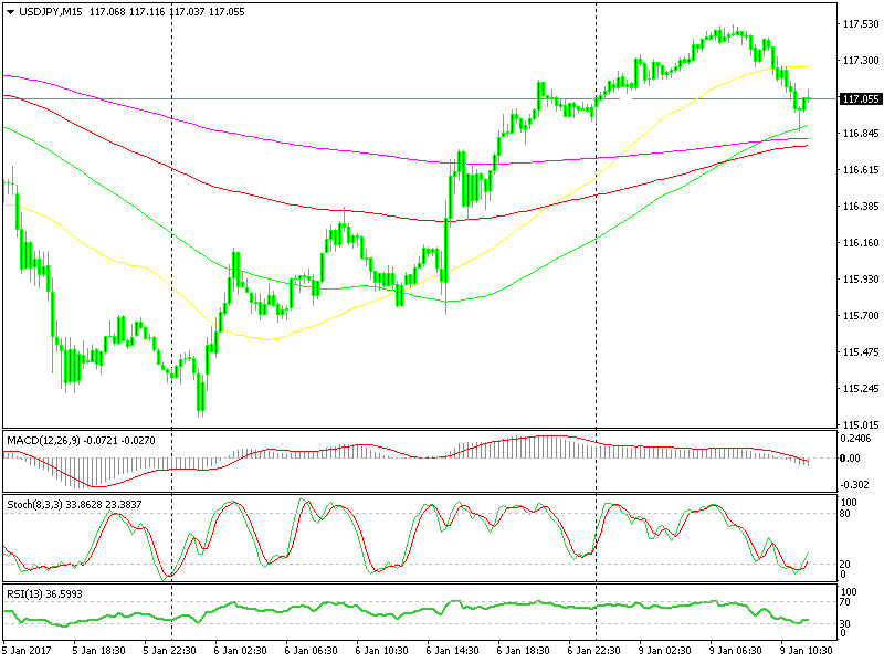 The moving averages are another technical indicator/signal which points up. The price is having difficulties breaking below these technical indicators in the H1 and 15-minute chart, so the 117 area seems to be providing some decent support.