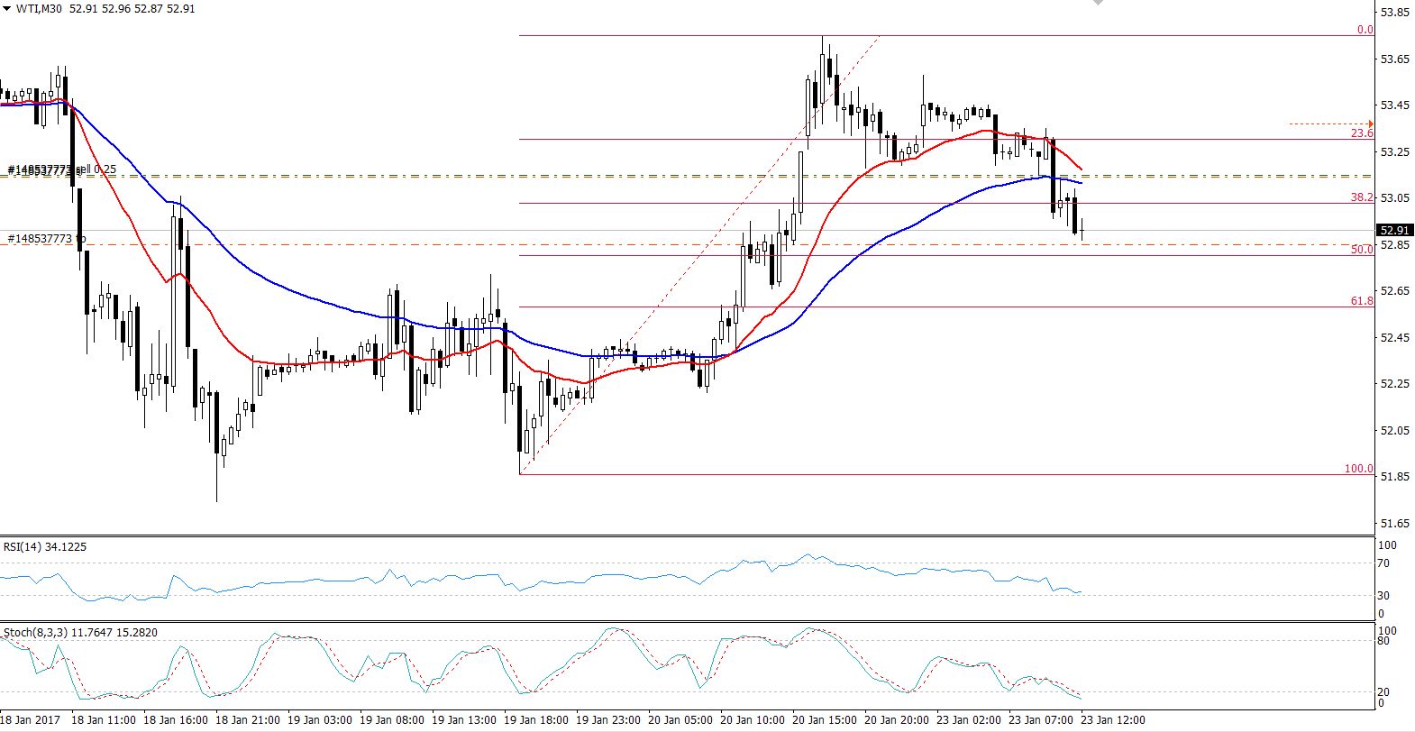As you may remember on Friday, WTI was massively bullish and it added more than 100 pips in the opening price of $52.19. So we can expect a slight retracement in the Oil initially to $53.03 (38.2%) level, but once it breaks below this level, it may go for 52.57 (61.8%) Fibo level. ย Here, the idea is to sell the WTI at $53.15, with a stop-loss at $53.35 along with the take profit at $52.85.