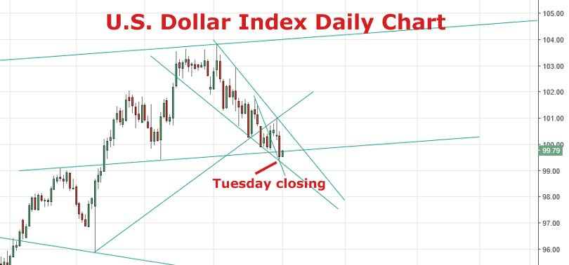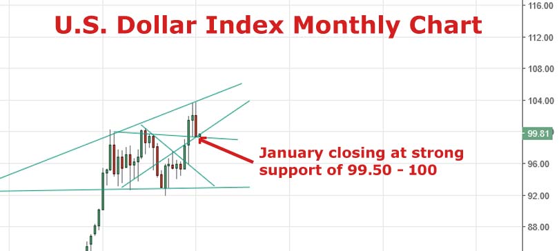 Tuesday was the closing day of January 2017 and the U.S. dollar index dropped based on the unexpected statement from President Trump’s top trade adviser, Peter Navarro, as mentioned earlier. That was supposed to be a correction just to complete the pattern or test of strong support in a monthly chart. However, the dollar still held and gave a monthly closing above 99.50, which was expected to happen and was mentioned in one of my earlier morning briefs of this week.