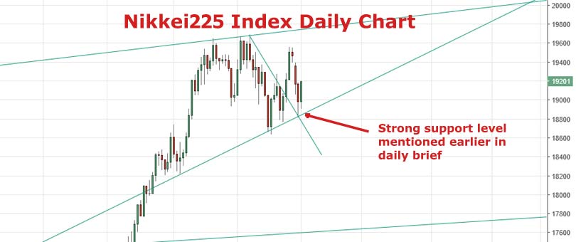 In the daily chart, we see that the Nikkei dropped yesterday to test the strong monthly upward trend channel at 19000, as mentioned earlier in this week’s morning brief that it will hold this level and produce the upside rally.