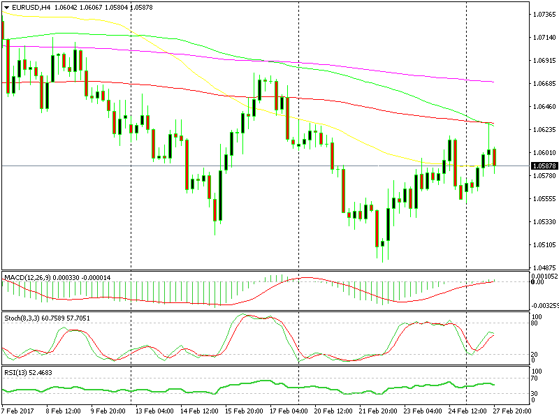 EUR/USD reached as high as 1.0631 (or 30, depending on your forex broker) and reversed instantly, ending up about 50 pips lower at the 50 SMA on the hourly forex chart.