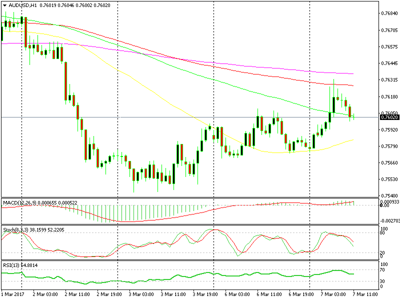 I saw that the RBA (Royal bank of Australia) had a meeting on the schedule last night, but no one expected any change in the interest rates or the monetary policy. So, I thought it would be reasonable to leave a pending order at 0.7605, just below the 100 SMA (green) on the hourly forex chart.