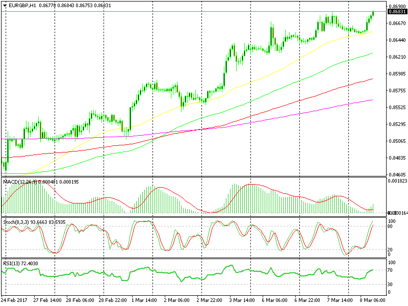 With GBP being on the back foot today, it´s no surprise to see EUR/GBP climbing higher. In fact, this has been the case for quite some time now. A couple of weeks, actually. Therefore, let´s see where the levels are (support in particular) in order to prepare for a possible trade.
