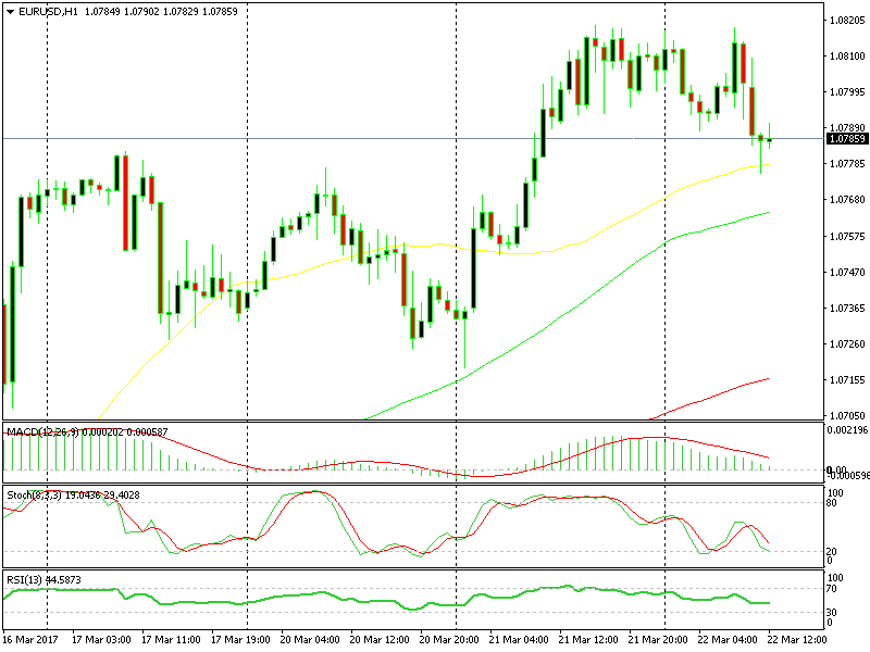 In the last few hours though, this forex pair has slipped below 1.08 again and gotten close to our take profit target. However, the 50 SMA (yellow) on the hourly forex chart is holding for the time being.