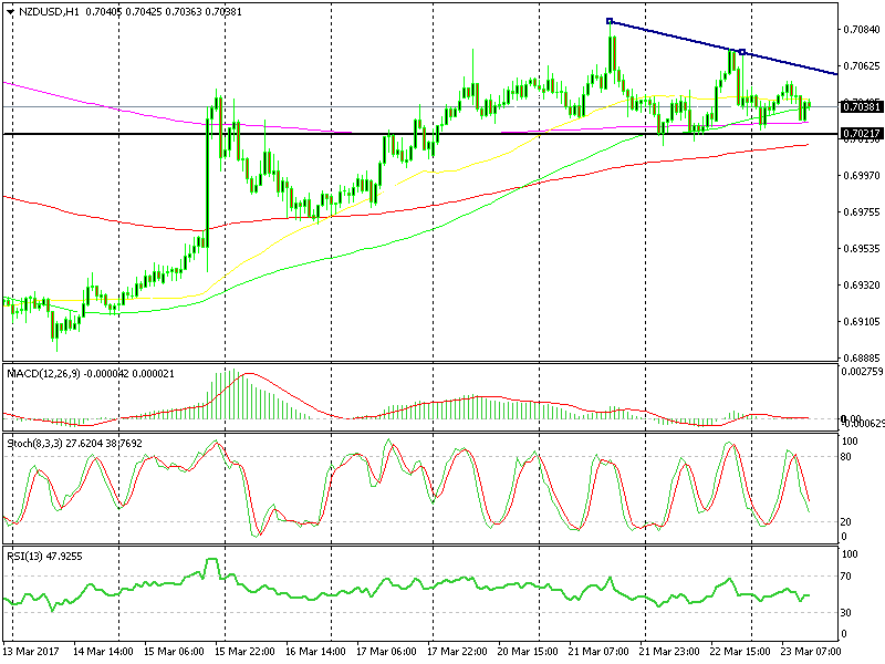 The closest support is provided by the 200 SMA (purple) on H1 chart at 0.7030. The 100 SMA (red) is climbing up and will meet the lower line of the triangle at 0.7020, so that will be the second level to overcome.