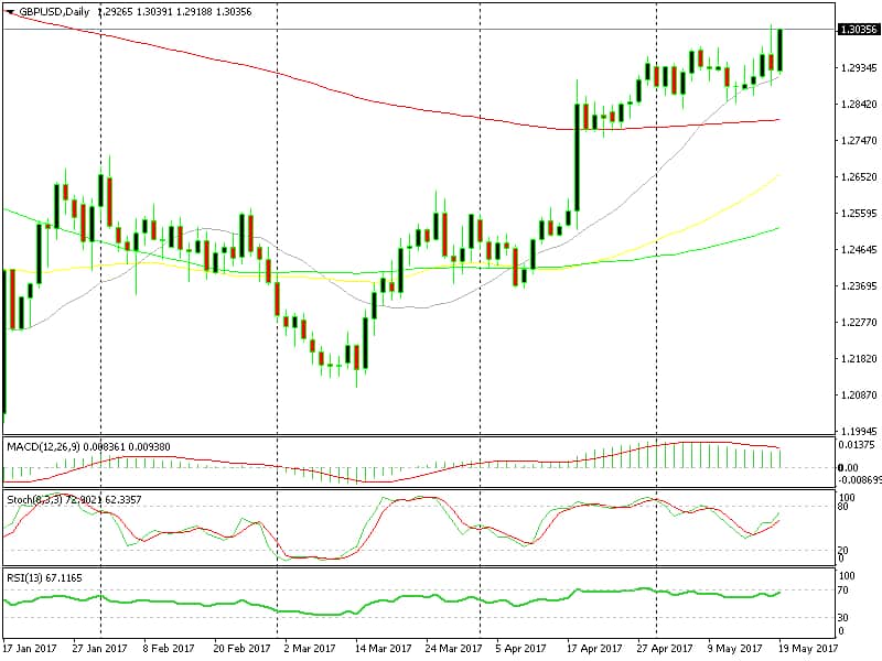 Last month GBP/USD broke above the 100 SMA (red) on the daily chart and so it became support. This month we saw a bit of consolidation with the 20 SMA (grey) providing support all week. It was holding the dips well and it was just a matter of time before the 1.30 got broken. Too bad we didn´t see this chart earlier in the week.