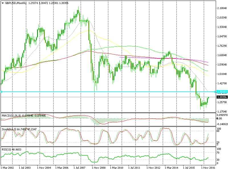 There´s still a lot of room left upwards on the monthly chart, though. You can see that RSI and stochastic are around the middle of the table and headed up. The closest resistance level is at 1.35, nearly 5 cents up and that´s where the 20 SMA stands on this forex chart. But, we don´t know how long it will take the price to get there (after all, it´s all about politics, nowadays).