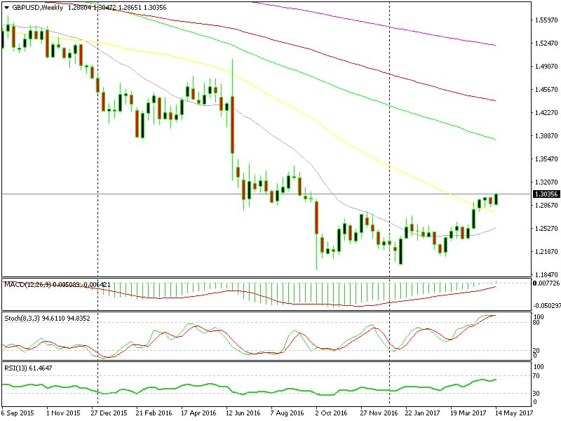 On the weekly forex chart, the price broke above the 50 SMA (yellow) and it hasn´t looked back since, although the stochastic indicator is severely overbought and RSI is getting there too.