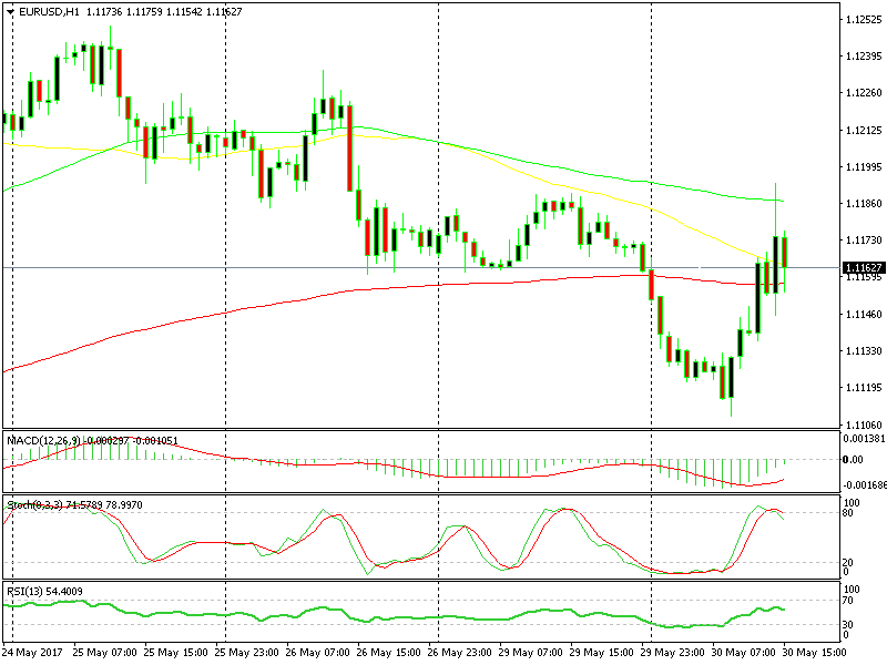 But, this forex pair made an unexpected reverse and jumped about 50 pips higher in just a minute. Luckily, the price is back down below the opening price of our EUR/USD signal now.