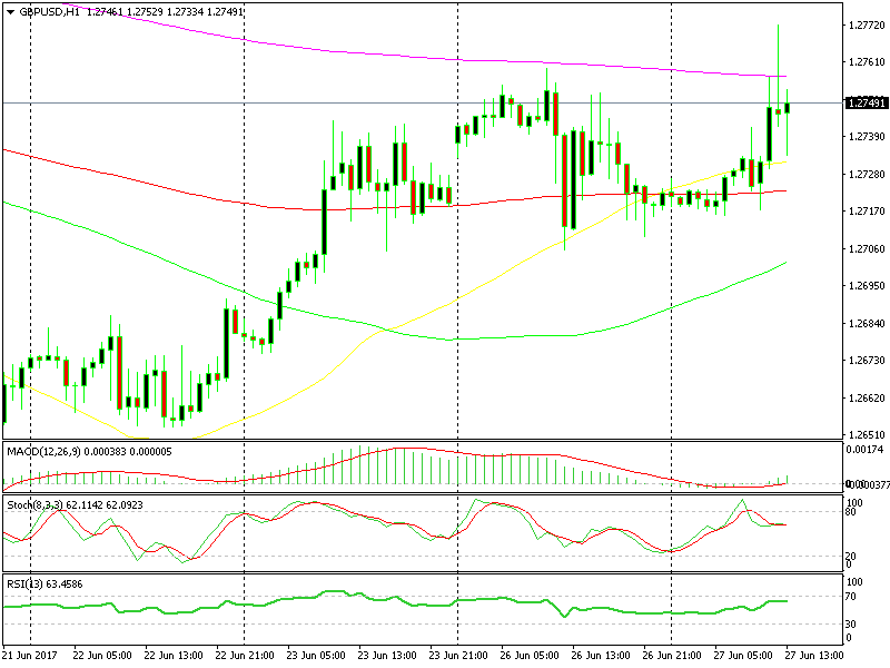 GBP/USD jumped for a moment above the 200 SMA (purple) on the hourly forex chart, but it quickly dived back down. We opened a sell forex signal around there, which is progressing pretty well, but I hope that the weakness we have seen in the USD this morning doesn´t ruin our plans.