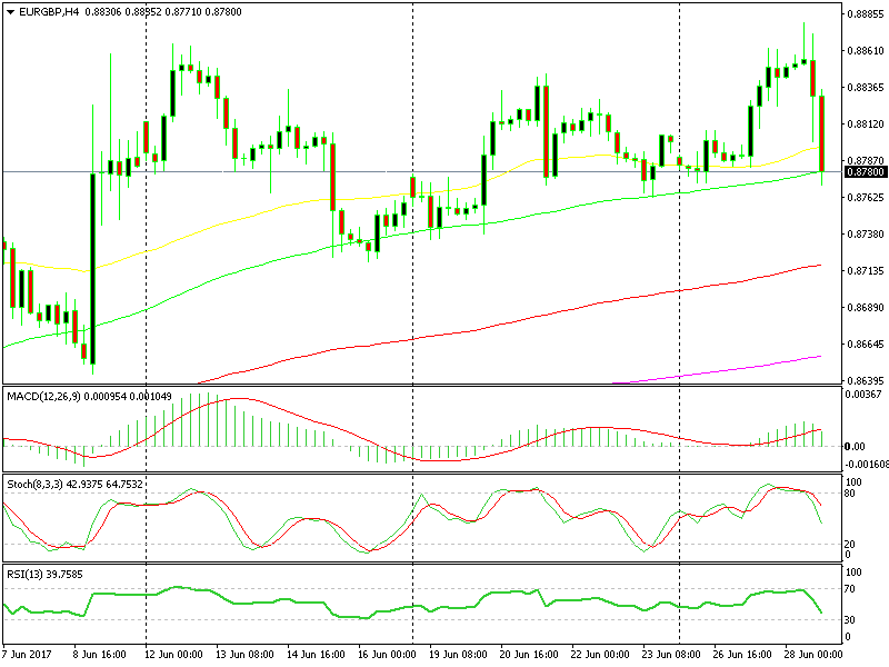 GBP gained about 150 pips off of Carney´s comments which sent EUR/GBP nearly 100 pips lower to the 100 SMA on the hourly forex chart.