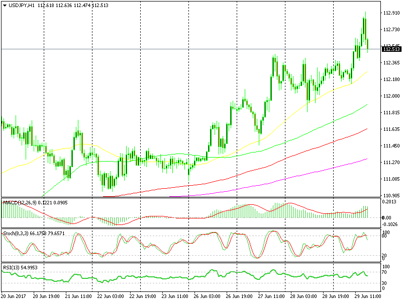 Actually, USD/JPY has retraced about 40 pips lower over the last couple of hours, which gives us a good opportunity to jump in on the northbound USD/JPY train. Although I prefer to wait for the price to reach the 50 SMA (yellow) on the hourly forex chart, it probably won't be long.