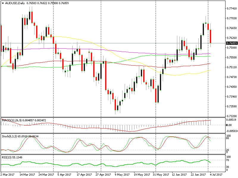 On Friday, we decided to open a long-term sell forex signal in AUD/USD. Though this pair was in an uptrend at the time so it might not have seemed like a good idea, now we´re about 100 pips in profit. We are now perfectly positioned to take advantage of a great bearish setup.