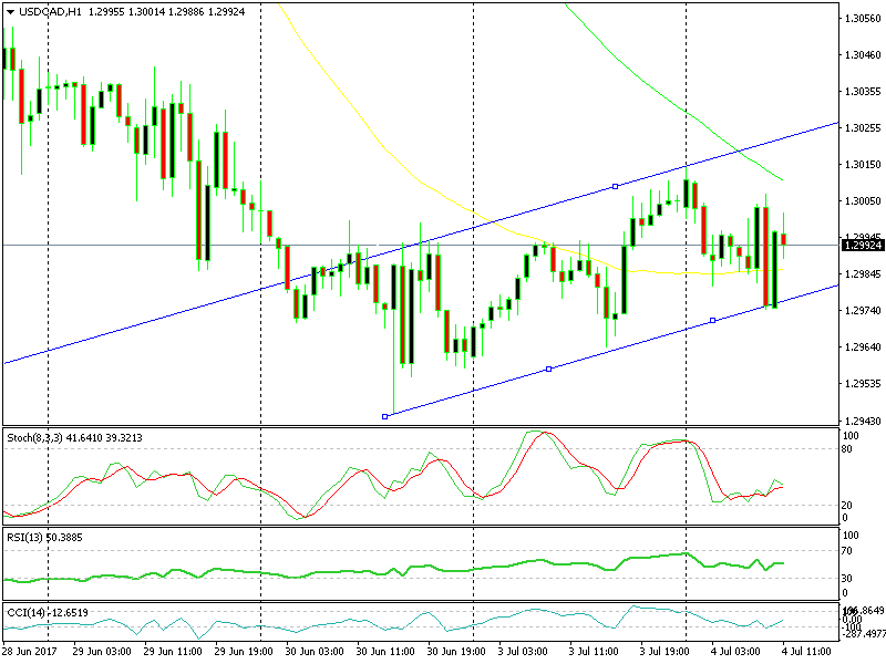 We used moving averages as entry points for our forex trades in this pair. We opened a sell forex signal when USD/CAD retraced higher to the 20 SMA (grey) on the hourly forex chart.