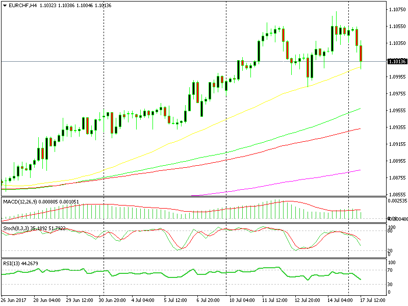 Last Friday we opened a forex signal in EUR/CHF. This forex pair has been following a steep uptrend over the last 3 weeks. We figured that we could get in long, in the same direction as the trend, after all, the trend is our friend.