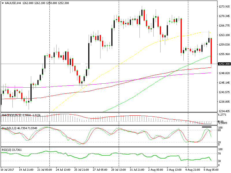 Last week we saw the precious metal consolidate and trade sideways, which wasn´t a good sign for Gold bulls. Then, on Friday, Gold took a massive 16 cent dive after the US employment report. That was the second signs that a reverse or a deeper retrace was coming.