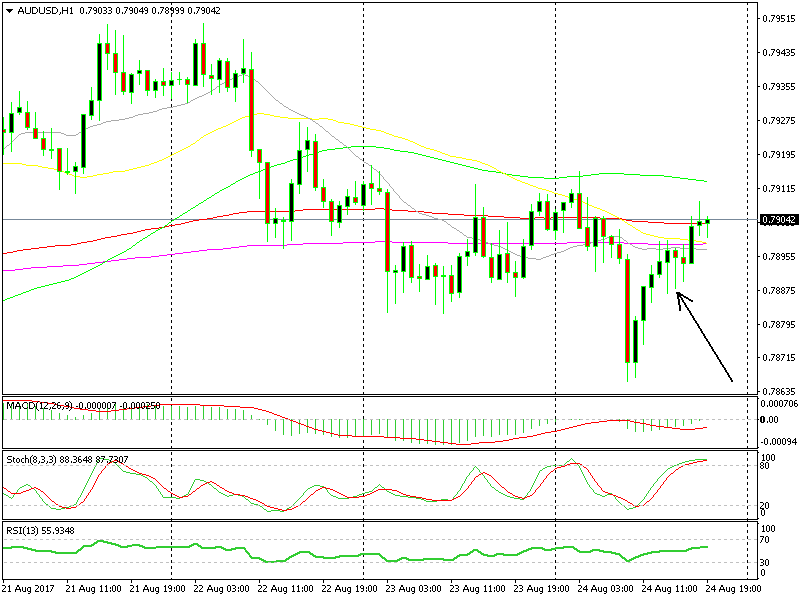 A while ago we opened a sell forex signal in AUD/USD after this pair made a pullback higher from overnight lows which reached 0.7867.