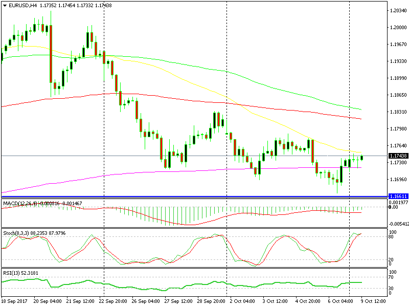 Similarly to AUD/USD, EUR/USD has been in a downtrend for more than two weeks after failing to beak 1.21. It slipped to 1.1670 on Friday, below the 200 SMA (purple), but it has climbed back above it. Now the price is stuck between the 200 SMA at the bottom and the 50 SMA (yellow) on top.