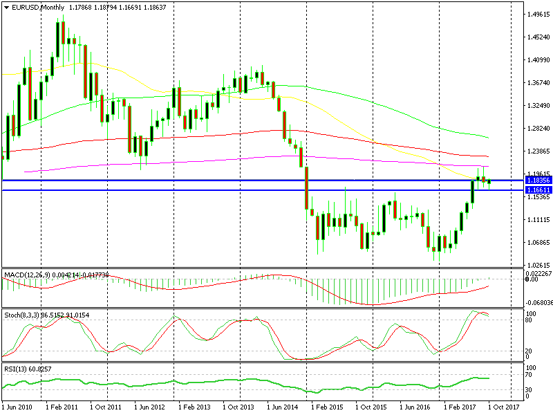 As you see on the monthly EUR/USD chart above, the price is severely overbought and the last two monthly candlesticks look like dojis. Dojis are bearish reversal indicators after an uptrend.
