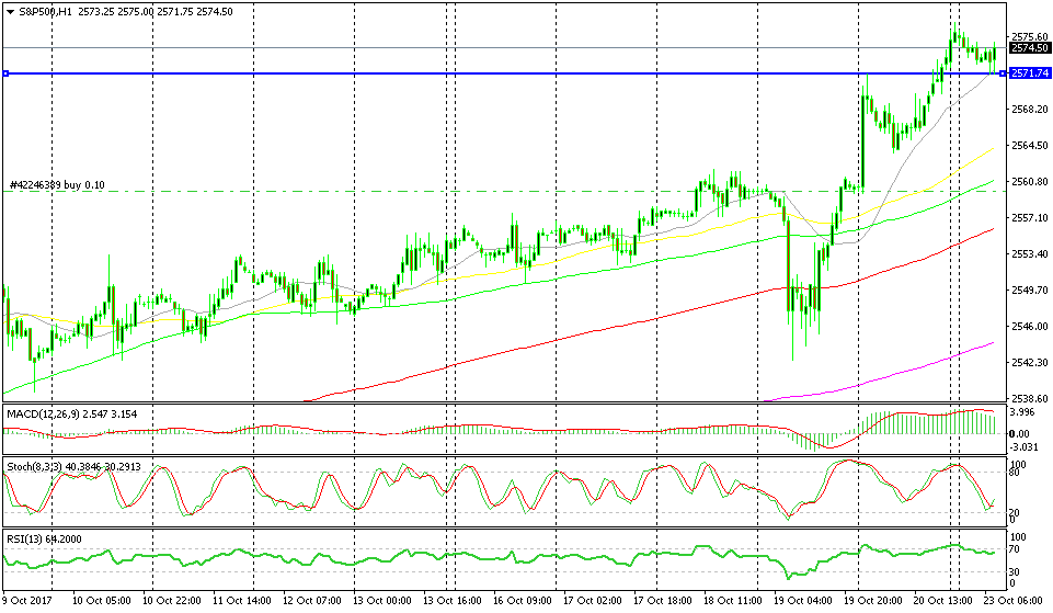 Friday’s resistance is now turning into support which adds extra strength to the resistance, so it’s three indicators now. The fourth technical indicator is the trend, the recent trend. S&P has surged since it made a decent pullback on Thursday, so the trend is bullish and it is strong. There you go, four indicators pointing up. All we have to do now is leave this trade run its course.