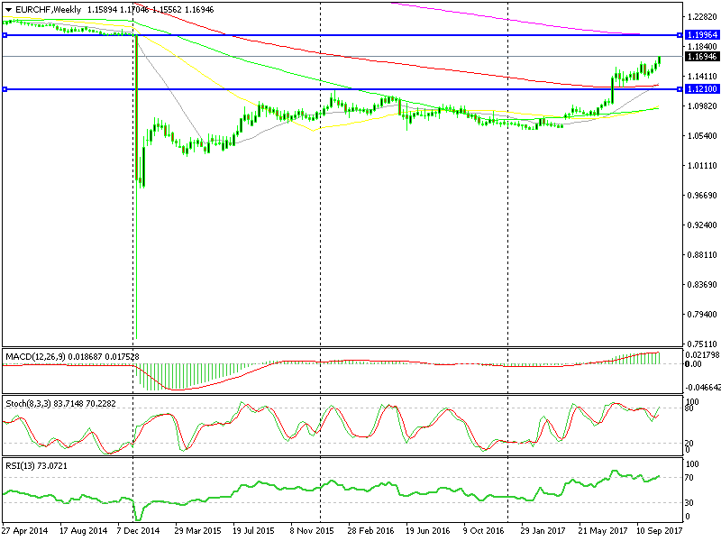 EUR/CHF started a big climb in April this year after Macron’s win in France. It jumped a couple of cents that weekend, and then it broke the long term resistance at 1.12. The 100 SMA (red) was hanging around there which added extra strength to that level. But when a strong level gets broken, the move that follows is quite violent.