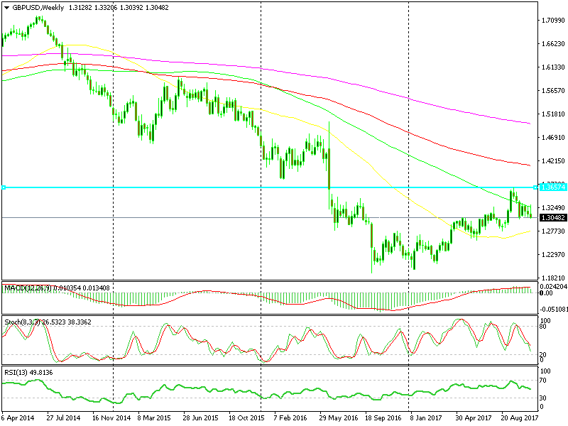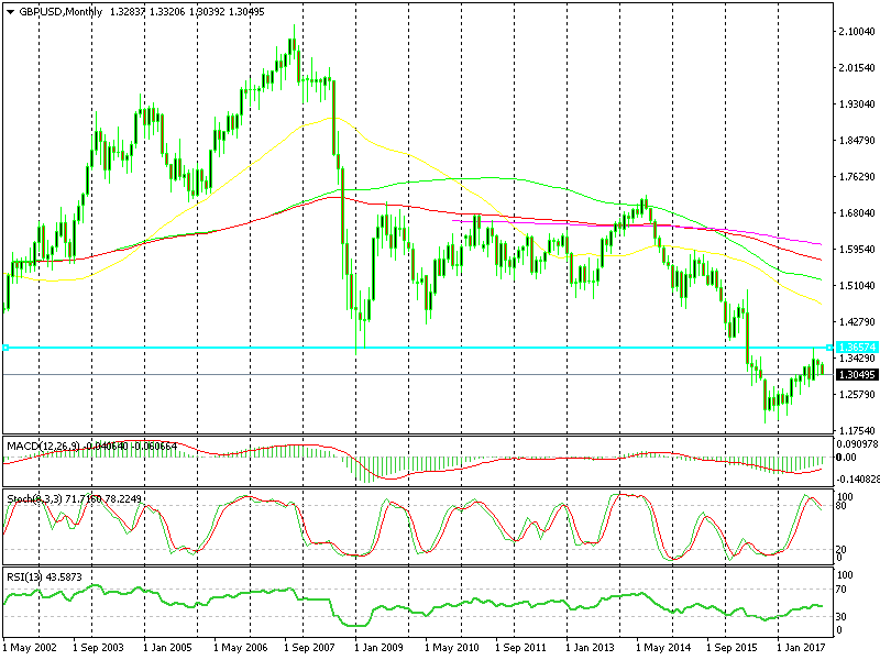 So, GBP turned lower and now the major GBP/USD charts look pretty. The monthly chart is turning lower after failing at resistance around 1.3650s, which used to be support back in March 2009, as you can see above. There’s also plenty of room for stochastic to run until it becomes oversold.