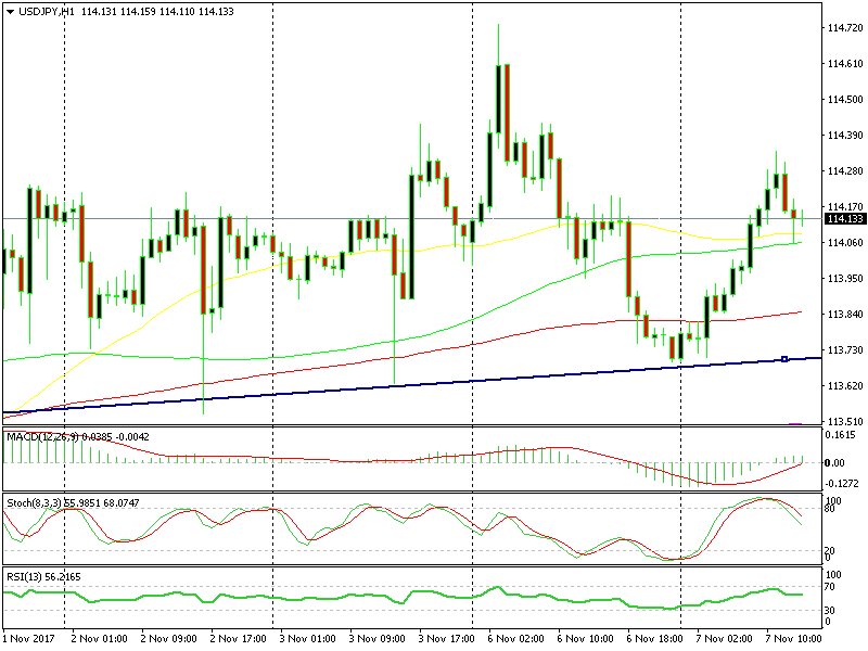 Another bullish sign is the previous hourly candlestick. It closed as a pin, which is a reversing signal. The price has slipped lower in the last couple of hours after topping out at 114.34, so according to the candlestick trading strategies, now we are supposed to see a reversal higher.