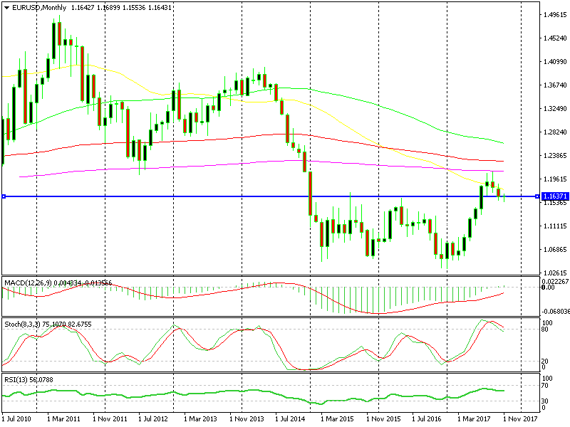 As you can see from the EUR/USD chart, EUR/USD closed last week at this long-term resistance level around 1.1660. It closed above the 100 SMA (red) which might turn into support with the moving average around 30 pips lower.
