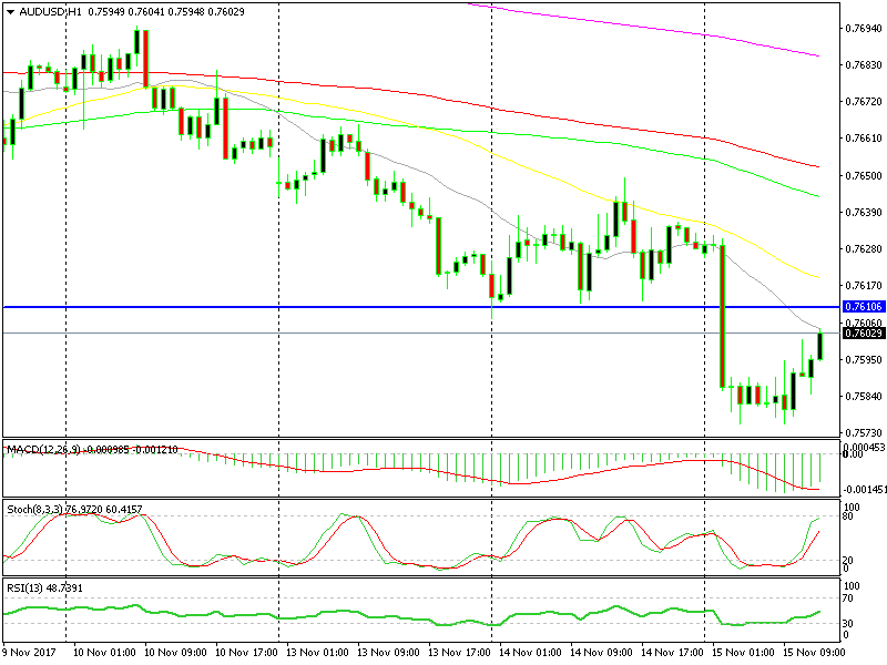 Besides that, the price has touched the 20 SMA (grey) which is providing resistance on top. The main reason that we went short is the fact that the AUD has been feeling pretty weak recently. Now that the pair is overbought, the sellers are likely to return.