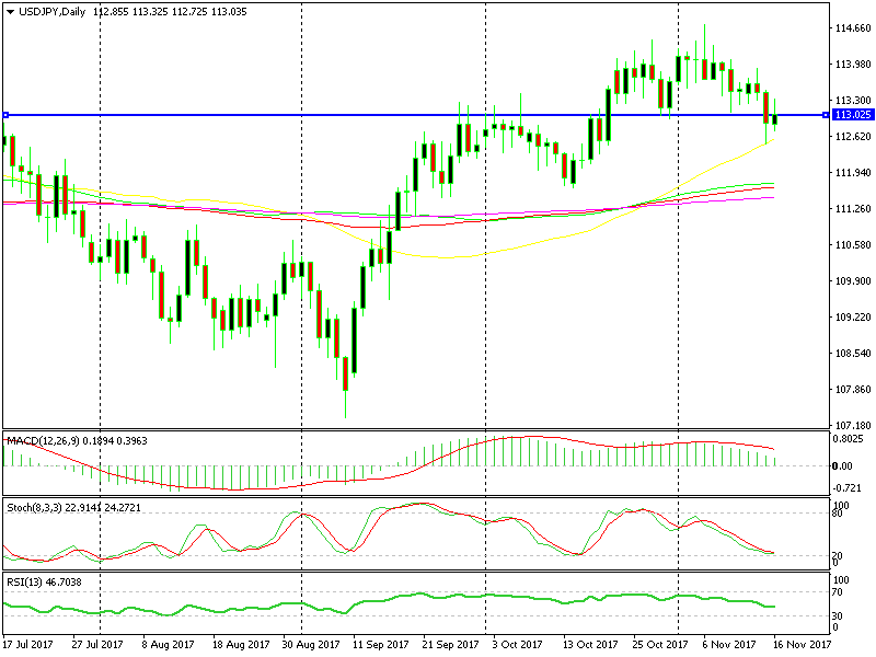 As you can see from the daily USD/JPY chart above, this forex pair has been in an uptrend in the last two months, but it is now turning higher. It touched the 50 SMA (yellow) yesterday in the afternoon and the sellers called it a day. The stochastic indicator became oversold as well which was another reason for the sellers to give up. Although, buyers must take out the resistance around 113 first, so this can be considered a proper reverse.