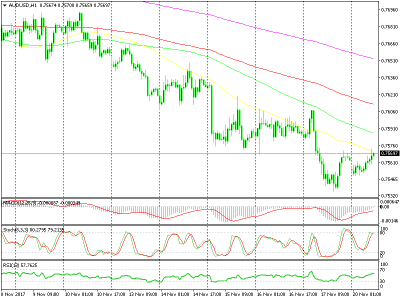 Now we’re back up here at this moving average, and it looks like it is providing resistance again. The stochastic indicator is already overbought on the hourly AUD/USD chart, which is another sign that the retrace might be over, apart from the moving average and the downtrend. So, we opened this forex signal, now let’s give it the time it needs to evolve.