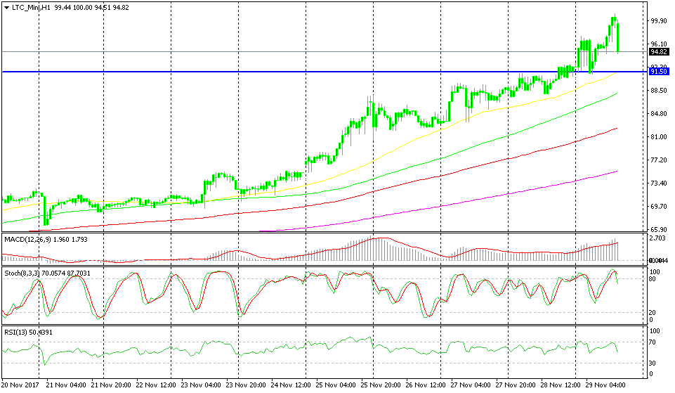 That area used to be resistance before, so it is likely it will turn into support now. It comes at $91.50 at the moment. By the time we will get there (if we do), the hourly chart would have become oversold. That’S where I will be looking to buy Litecoin.