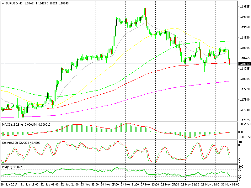 As you can see from the hourly EUR/USD chart above, the sellers had an easy time killing every pullback higher. They came in at the 100 SMA (green) first, then they build their barriers at the 50 SMA (yellow) as this moving average caught up with the price.