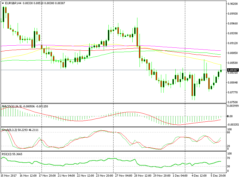 As you can see from the EUR/GBP chart above, this forex pair has gone through another retracement period during the night. It reached the 50 SMA (yellow) a few minutes ago but that was it. The price touched it and quickly reversed. This sort of price action means that there are sellers clustered up there waiting for a chance to sell.